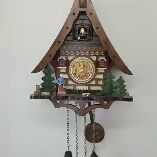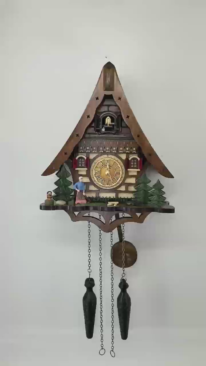 - Design & Aesthetics: Shaped like a cozy chalet with a steeply pitched roof, detailed carvings, and red-shuttered windows. The roof includes a small door for the cuckoo bird to emerge. Below the clock face, a scenic platform showcases evergreen fir trees, a charming static figurine of a woman in traditional attire (blue dress, white headscarf, and pink apron) depicted farming with a hoe tool over a small patch on the ground, and a rustic barrel accent on the left side.