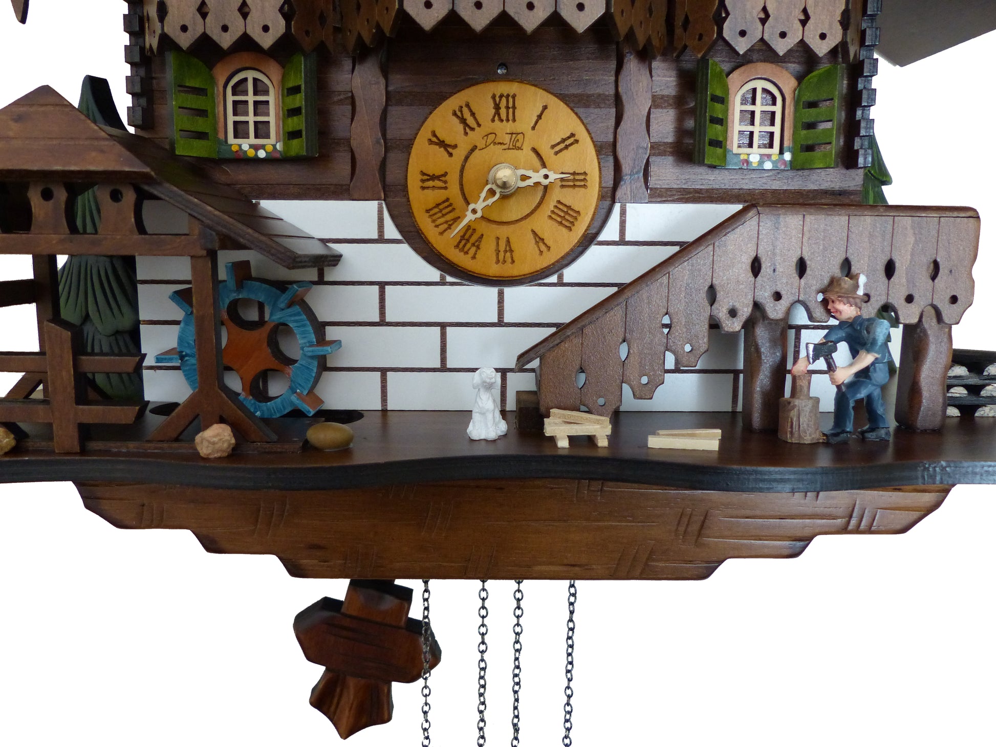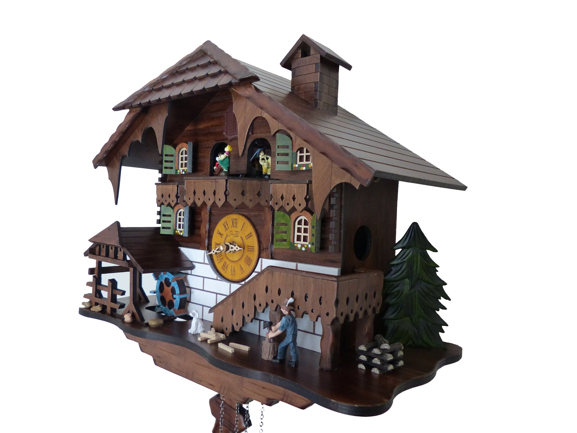 - Authentic Black Forest-inspired design with moving wood chopper, mill wheel, and dancing figurines